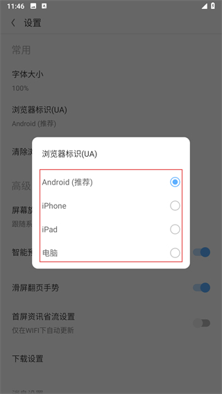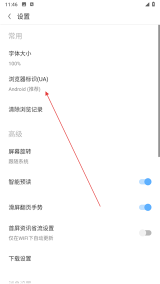 3、在设置页面的常用分类,点击浏览器标识UA选项,弹出标识选择的窗口。