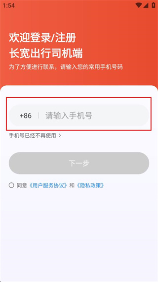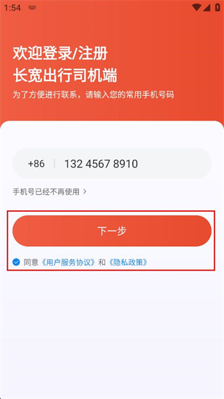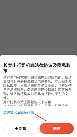 1、阅读长宽出行司机端法律协议及隐私政策,确认后点击同意按钮,进入登录注册界面。