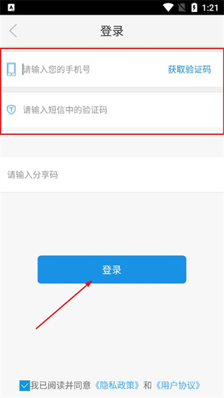 4、在登录界面输入手机号,获取并填写验证码,勾选协议后点击登录按钮。