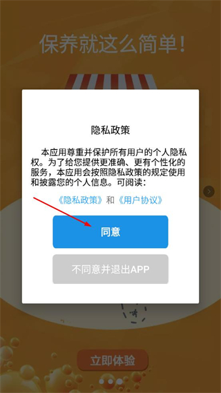 1、打开汽车保养软件,弹出隐私政策弹窗后,点击同意按钮继续使用软件。