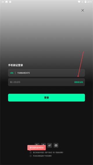 2、进入登录的页面内,输入手机号并点击获取验证码。