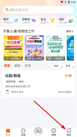 1、打开齐鲁人才app,在首页找到底部我的选项并点击,进入个人页面。