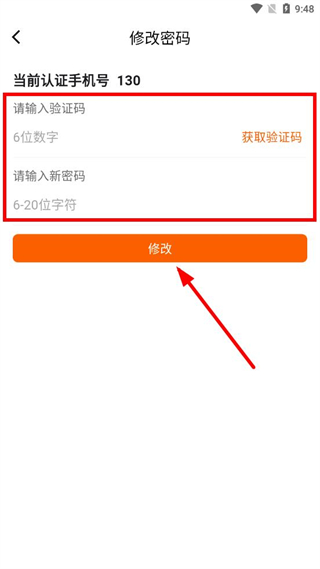4、点击获取验证码,输入收到的验证码,再填写新密码,最后点击修改即可完成密码设置。