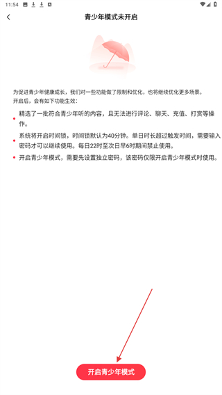 5、在青少年模式的页面内,了解后点击开启青少年模式即可。