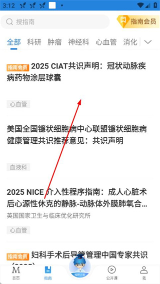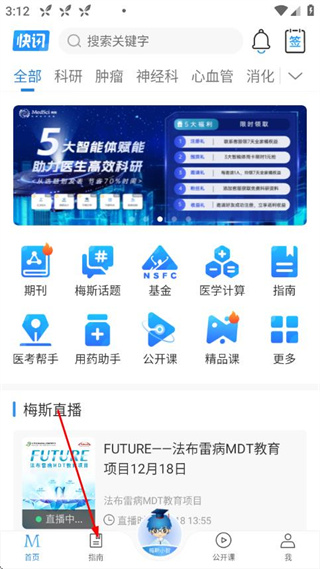 1、 打开梅斯医学app的首页,点击底部指南选项,进入指南页面。