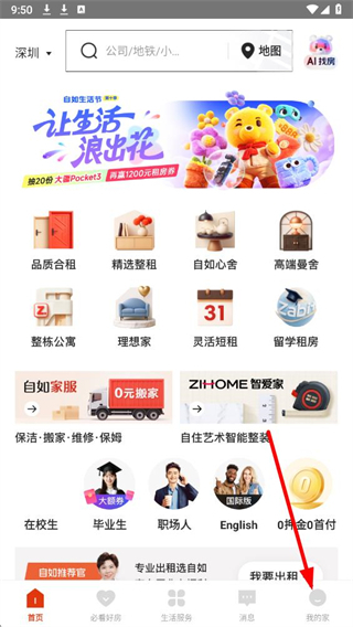 1、进入自如app,点击页面底部我的家选项,进入我的页面。