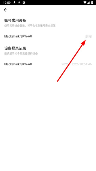 4、在账号常用设备板块中,找到目标设备右侧的删除按钮并点击,即可移除该登录设备信息。