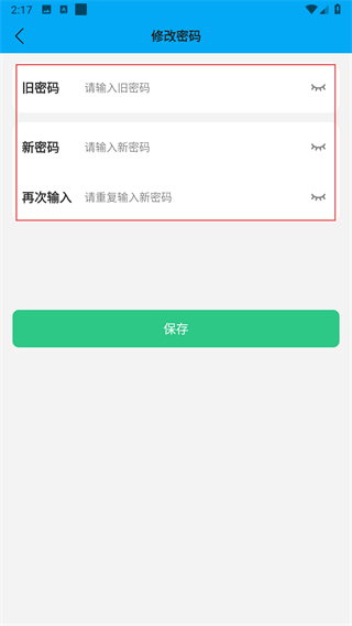 4、在修改密码页面依次输入旧密码、新密码、再次输入新密码,确认后点击保存。