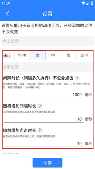 4、在详细设置界面选择点击速度为快,调整间隔时长等参数后,点击保存完成设置。