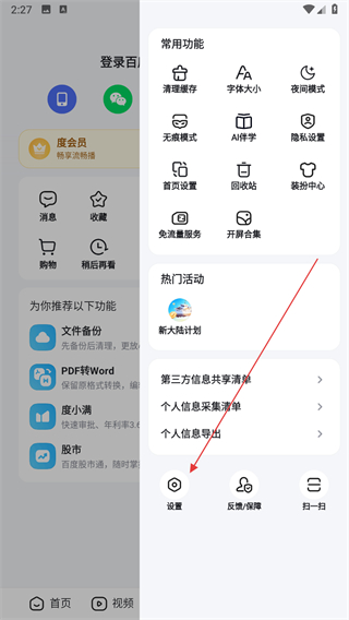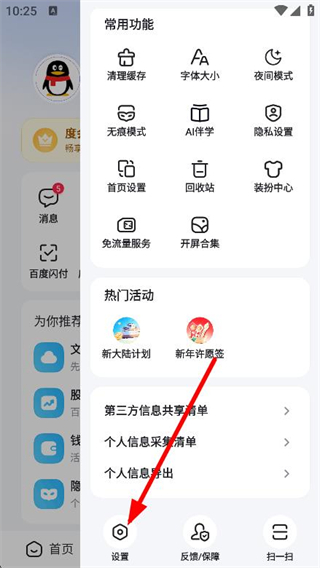 3、在功能列表中找到设置选项,点击该选项进入百度的设置操作页面。