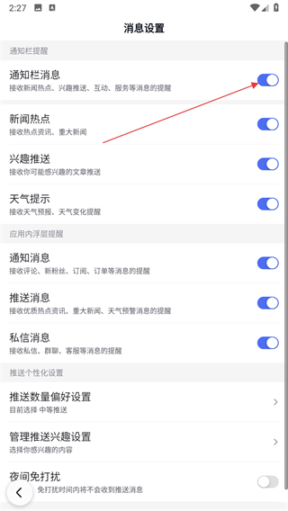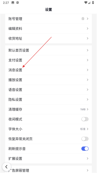 4、在设置页面中找到消息设置选项,点击进入后找到通知栏消息开关。