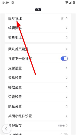 4、进入设置页面后,找到并点击上方账号管理选项。
