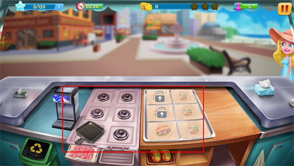 3、进入快餐车场景后,查看操作台区域的设备与食材,准备进行餐食制作。