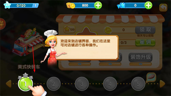 2、在店铺页面点击数字1对应的选项,进入美式快餐车的经营场景。