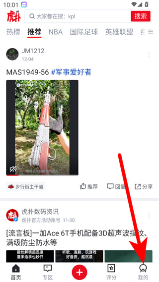 1、在虎扑首页,点击右下角我的选项,进入个人界面。