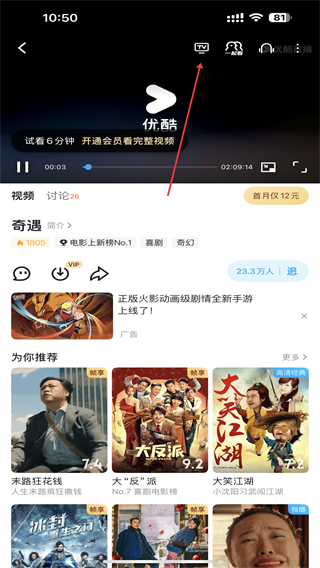 3、进入播放的页面内,点击画面中TV的功能图标。