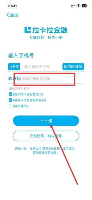 4、填入收到的验证码,点击下一步即可完成登录。