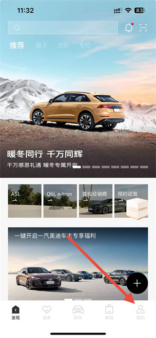 1、打开一汽奥迪app,在首页点击下方我的选项,进入个人界面。