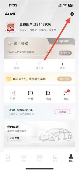 1、打开一汽奥迪APP后,点击首页底部我的选项,进入个人界面。