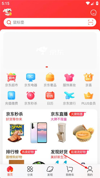 2、进入京东首页,找到页面底部的我的选项,点击该选项进入对应的个人中心页面。