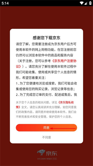 1、打开京东APP后,查看弹出的协议及隐私政策内容,确认后点击页面中的同意按钮。