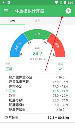 1、打开体重指数计算器app,点击页面右上角的+,弹出体重输入窗口。