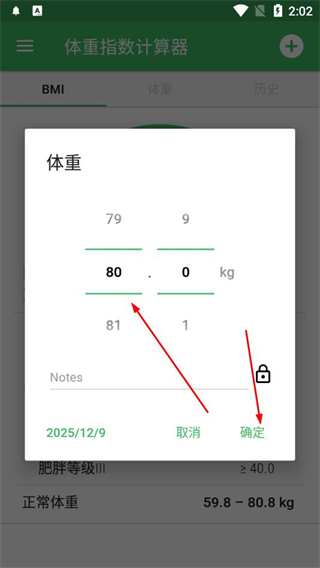 2、在体重输入窗口中,调整数值,确认后点击确定。