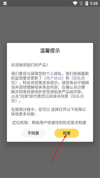 1、打开软件后,查看弹出的温馨提示弹窗,点击同意按钮,完成相关协议的确认操作。
