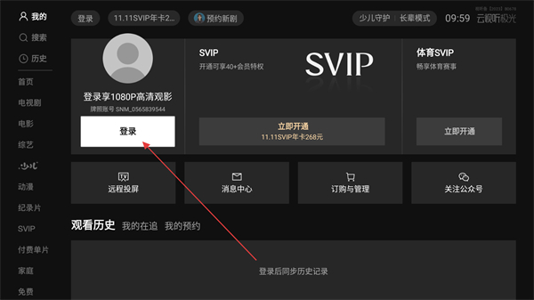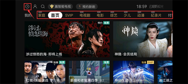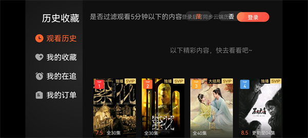 2、点击首页左上角的时钟标志,就能查看自己的观看记录、收藏记录等详细信息;