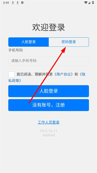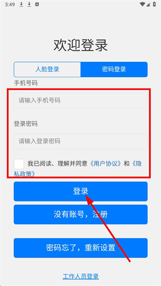 3、在密码登录界面,依次输入手机号码、登录密码,勾选相关协议后点击登录按钮。