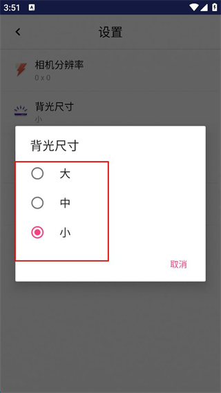 4、在背光尺寸选择窗口中可选择大、中、小三种尺寸来设置背光尺寸。