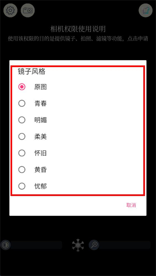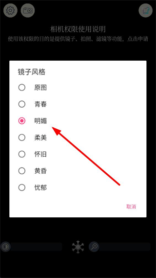 2、在镜子风格选择列表中,选择想要设置的风格,如青春、明媚等。