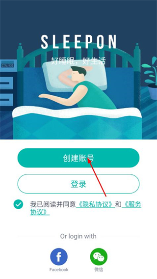 1、打开森林睡眠APP,在初始页面勾选协议后点击创建账号。