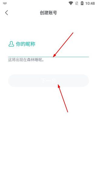 2、在创建账号页面填写昵称,完成后点击下一步。
