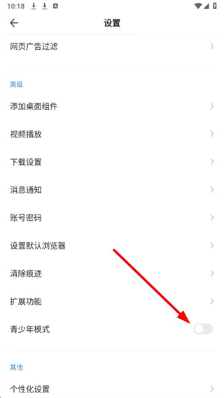 3、在设置界面中,找到青少年模式选项,点击其右侧的开关按钮触发开启弹窗。