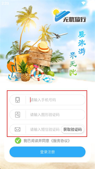 1、打开无忧旅行,找到手机号码输入框,填写对应的手机号码,再找到图形验证码输入框填写内容。
