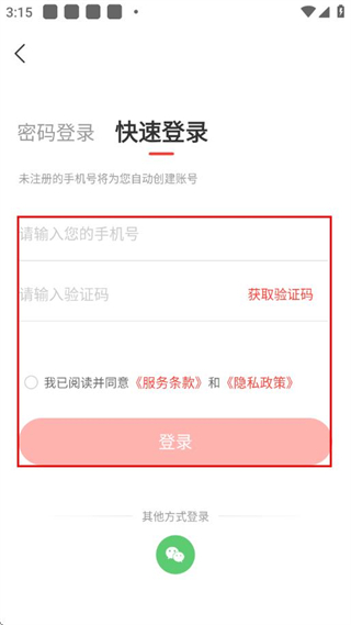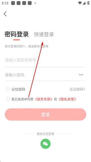 3、在登录页面选择快速登录标签,切换到快速登录模式。