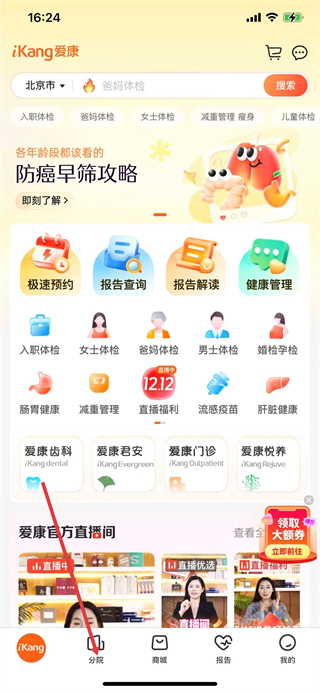 1、打开爱康,点击底部导航栏的分院选项。