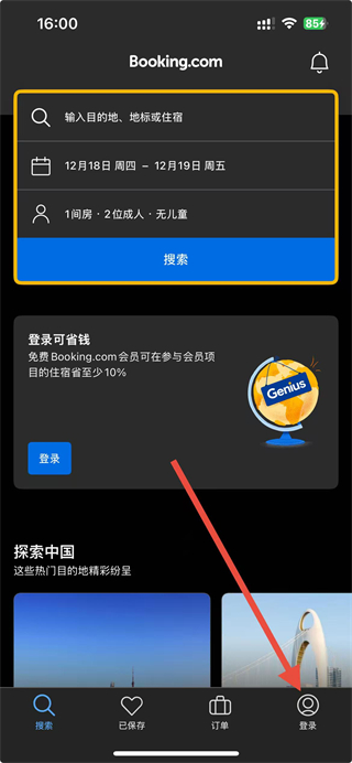 -安装应用程序后,使用Booking.com网站上的账户信息登录。您的酒店预订、搜索记录、浏览记录、心愿单和账户资料会自动在应用程序中显示。