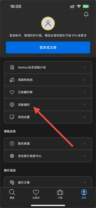 2、在登录页面的功能列表中,找到设备偏好选项并点击,进入设置功能界面。