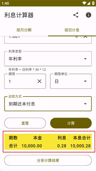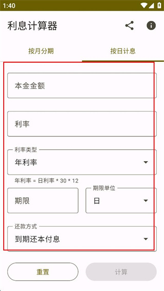 2、在按日计息页面,确认利率类型期限单位还款方式等参数已自动适配。