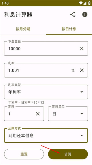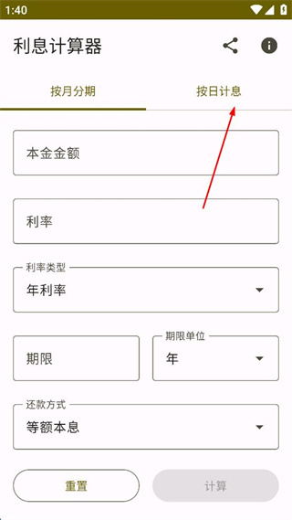 1、打开利息计算器软件,进入按月分期页面,点击切换至按日计息模式。