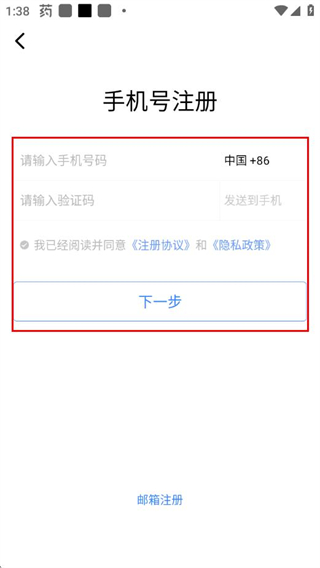 4、在注册页面填写手机号码、获取并输入验证码,勾选协议后点击下一步完成注册。