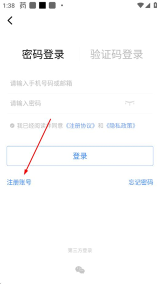 3、在登录页面点击注册账号选项,进入手机号注册页面。