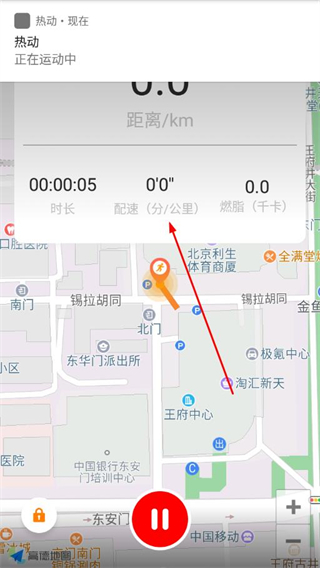 2、运动过程中,可查看页面实时显示的距离、时长、配速、燃脂量等数据。