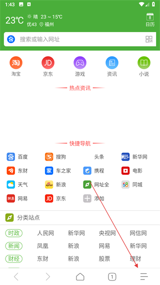 1、极速浏览器点击底部菜单栏最右侧的三横线按钮,打开功能菜单。