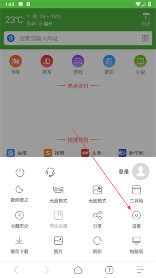 2、在功能选项列表里,找到设置按钮,点击该按钮进入浏览器的设置页面。