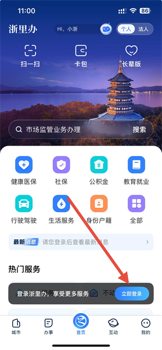 1、在浙里办首页点击立即登录按钮,跳转到登录页面。