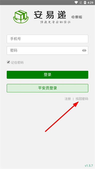 1、进入安易递收寄版的登录界面后,找到找回密码选项并点击,跳转至修改密码的信息填写页面。