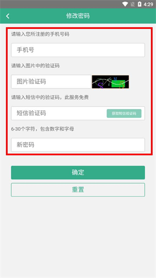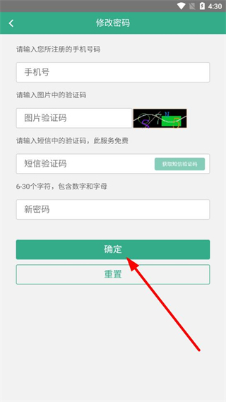 2、在修改密码页面,依次填写注册的手机号、图片验证码,获取短信验证码,设置符合要求的新密码。